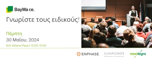 Η BayWa r.e. συνδιοργανώνει στις 30 Μαΐου στο NJV Athens Plaza τεχνική παρουσίαση σε συνεργασία με τους κορυφαίους κατασκευαστές Enphase, SunPower και novotegra, με τους οποίους συνεργάζεται παγκοσμίως.