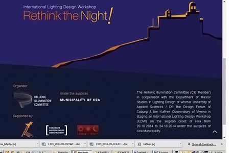 To διεθνές εργαστήριο σχεδιασμού φωτισμού “Rethink the Night!” και η Ελληνική Επιτροπή Φωτισμού  διοργανώνουν συνάντηση στην Κέα από τις 20 ως τις 24 Οκτωβρίου. Το γεγονός θα λάβει χώρα στο όμορφο κυκλαδίτικο νησί σε συνεργασία με το τμήμα σχεδιασμού φωτισμού του γερμανικού πανεπιστήμιου εφαρμοσμένων σπουδών Wismar –Department of Master Studies in Lighting Design of Wismar University of Applied Sciences,του σχεδιαστικού φόρουμ Design Forum Oberfranken of Coburg και το Παρατηρητήριο της Βιέννης- Kuffner Observatory of Vienna. Στο πλαίσιο του εργαστηρίου, οι διοργανωτές καλούν τους ενδιαφερόμενους να πλαισιώσουν τους σχετικούς πειραματισμούς με το φως .