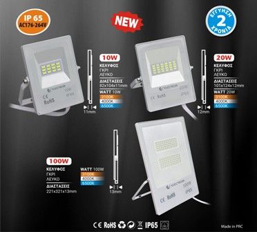 Διατίθενται σε 10W, 20W, 30W, 50W και 100W. Σε ψυχρό (6500Κ) φυσικό (4000Κ) και θερμό (3100Κ) χρώμα φωτισμού.
