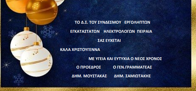 Το διοικητικό συμβούλιο του Συνδέσμου Εργοληπτών Εγκαταστατών Ηλεκτρολόγων Πειραιά, σας εύχεται καλά Χριστούγεννα. Με υγεία και ευτυχία ο νέος χρόνος!