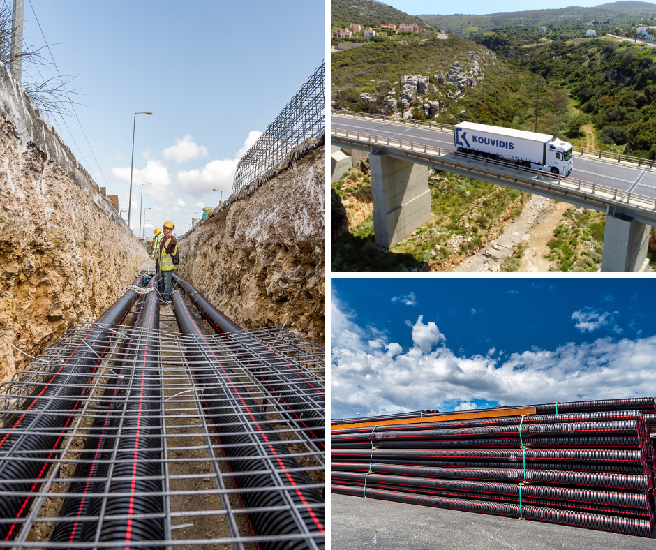 Για τις ανάγκες του έργου, η KOUVIDIS ενίσχυσε ακόμα περισσότερο το εσωτερικό των σωλήνων GEONFLEX N750, για την βέλτιστη όδευση των καλωδίων, αύξησε το μήκος τους από 6 σε 12 μέτρα και κατασκεύασε ειδικές σκάφες για την ευκολότερη και ασφαλέστερη μεταφορά τους.