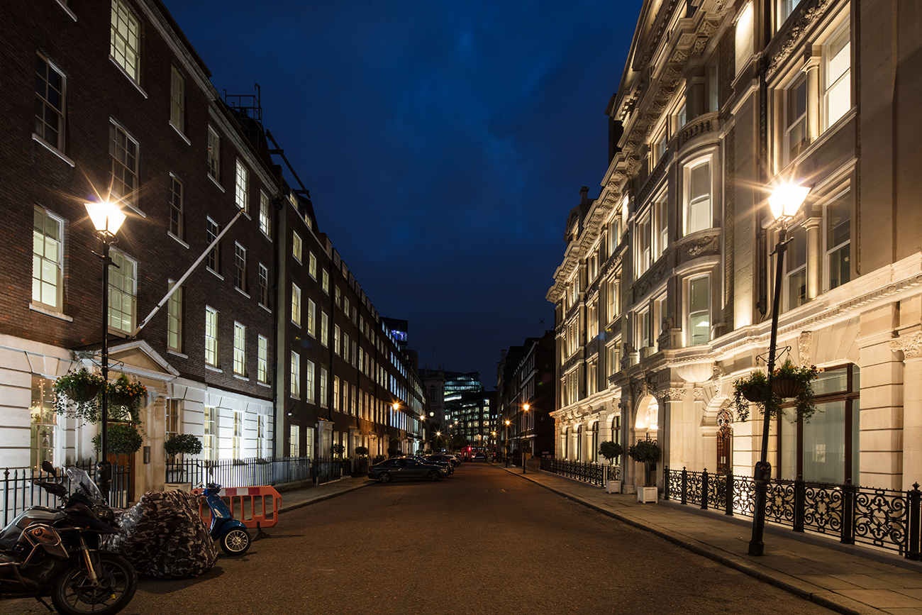 Ένα τυπικό φρεάτιο ισογείου του κεντρικού Λονδίνου, χρησιμοποιήθηκε για την απόκρυψη φωτιστικών και για τον φωτισμό του ισογείου, εξασφαλίζοντας ταυτόχρονα τον περιορισμό της αντανάκλασης προς τους ενοίκους. Με λιγότερο από ένα κιλοβάτ εγκατεστημένης ισχύος, πρόκειται για μια λύση χαμηλής ενεργειακής κατανάλωσης και κόστους, που μεταμορφώνει την πρόσοψη τη νύχτα. Ο σχεδιασμός της εγκατάστασης λαμβάνει υπόψη τον εσωτερικό χώρο του κτιρίου και δεν επηρεάζει τα γραφεία. Οι επιτόπιες φωτογραφίες και οι μακέτες υπήρξαν κρίσιμες για την επιτυχή ανάπτυξη του σχεδιασμού.