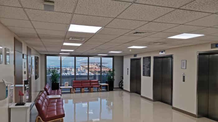 Για την κάλυψη των αναγκών φωτισμού στους κοινόχρηστους και βοηθητικούς χώρους του νοσοκομείου, χρησιμοποιήθηκαν φωτιστικά LED πάνελ με χαμηλό δείκτη θάμβωσης (UGR<19), στεγανά φωτιστικά υψηλής απόδοσης, καθώς και μονάδες ασφαλείας με αυτονομία τριών ωρών.