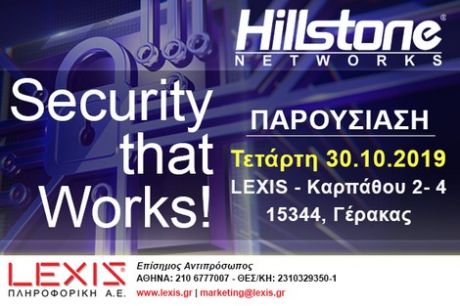 Η Lexis Πληροφορική Α.Ε., επίσημος αντιπρόσωπος του κορυφαίου παρόχου λύσεων Enterprise Security και Risk Management, Hillstone Networks, Inc., διοργανώνει παρουσίαση "Hillstone Networks – Security that Works" που θα πραγματοποιηθεί την Τετάρτη 30 Οκτωβρίου και ώρα 09:00 στις κεντρικές εγκαταστάσεις της LEXIS στο Γέρακα.