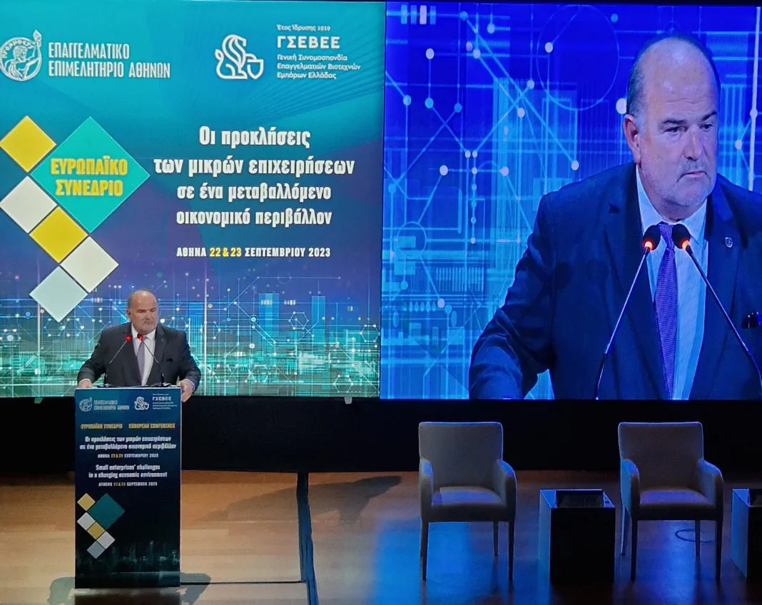 Οι προκλήσεις που καλούνται να αντιμετωπίσουν οι μικρομεσαίες επιχειρήσεις αλλά και οι δράσεις που θα πρέπει να υλοποιηθούν για τη βιωσιμότητά τους και την αναπτυξιακή τους πορεία, αναδείχθηκαν στο πλαίσιο του διήμερου Ευρωπαϊκού Συνέδριου που διοργάνωσαν η Γενική Συνομοσπονδία Επαγγελματιών Βιοτεχνών και Εμπόρων Ελλάδας και το Επαγγελματικό Επιμελητήριο της Αθήνας στις 22 και 23 Σεπτέμβριου 2023, στο Ωδείο Αθηνών, με θέμα «Οι προκλήσεις των μικρών επιχειρήσεων σε ένα μεταβαλλόμενο οικονομικό περιβάλλον».