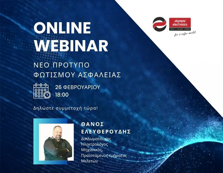 Νέο πρότυπο φωτισμού ασφαλείας EN 1838:2024 – Δωρεάν ενημέρωση από την Olympia Electronics. Η ηγέτιδα ελληνική εταιρεία στον τομέα των ηλεκτρονικών συστημάτων ασφαλείας, διοργανώνει ένα δωρεάν εξειδικευμένο webinar με θέμα το νέο πρότυπο φωτισμού ασφαλείας EN 1838:2024.