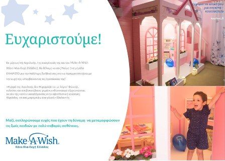 Στο πλαίσιο της συνεργασίας που έχει καθιερώσει με το φιλανθρωπικό οργανισμό Make-A-Wish Greece (Κάνε-Μια-Ευχή Ελλάδος) πρόσφερε πρόσφατα την πολύτιμη βοήθειά του, με την πραγματοποίηση των κατάλληλων ηλεκτρολογικών εργασιών, στη δημιουργία ενός υπέροχου κουκλόσπιτου, κάνοντας πραγματικότητα την ευχή της 5χρονης Αγγελικής.