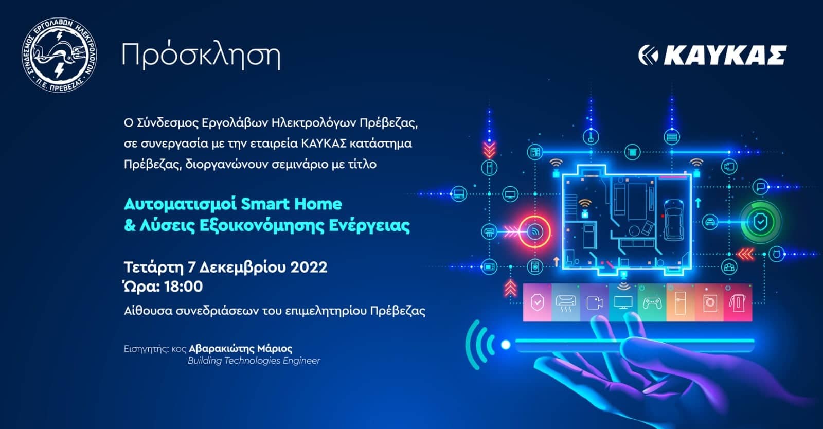 Σεμινάριο σε συνεργασία με την εταιρεία ΚΑΥΚΑΣ (κατάστημα Πρέβεζας) διοργανώνει ο Σύνδεσμος Εργολάβων Ηλεκτρολόγων Πρέβεζας την Τετάρτη 7 Δεκεμβρίου 2022. Ο τίτλος του σεμιναρίου είναι: «Αυτοματισμοί Smart Home και Λύσεις Εξοικονόμησης Ενέργειας» και θα πραγματοποιηθεί στην αίθουσα συνεδριάσεων του επιμελητηρίου Πρέβεζας.