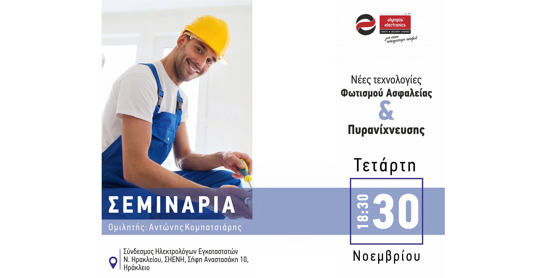 Ο Σύνδεσμος Ηλεκτρολόγων Εγκαταστατών Νομού Ηρακλείου (ΣΗΕΝΗ) σε συνεργασία με την OLYMPIA ELECTRONICS διοργανώνουν σεμινάριο με θέμα: «Νέες τεχνολογίες Φωτισμού Ασφαλείας και Πυρανίχνευσης» την Τετάρτη 30 Νοεμβρίου 2022, στις 18:30 στην αίθουσα του ΣΗΕΝΗ (Σήφη Αναστασάκη 10, Ηράκλειο).