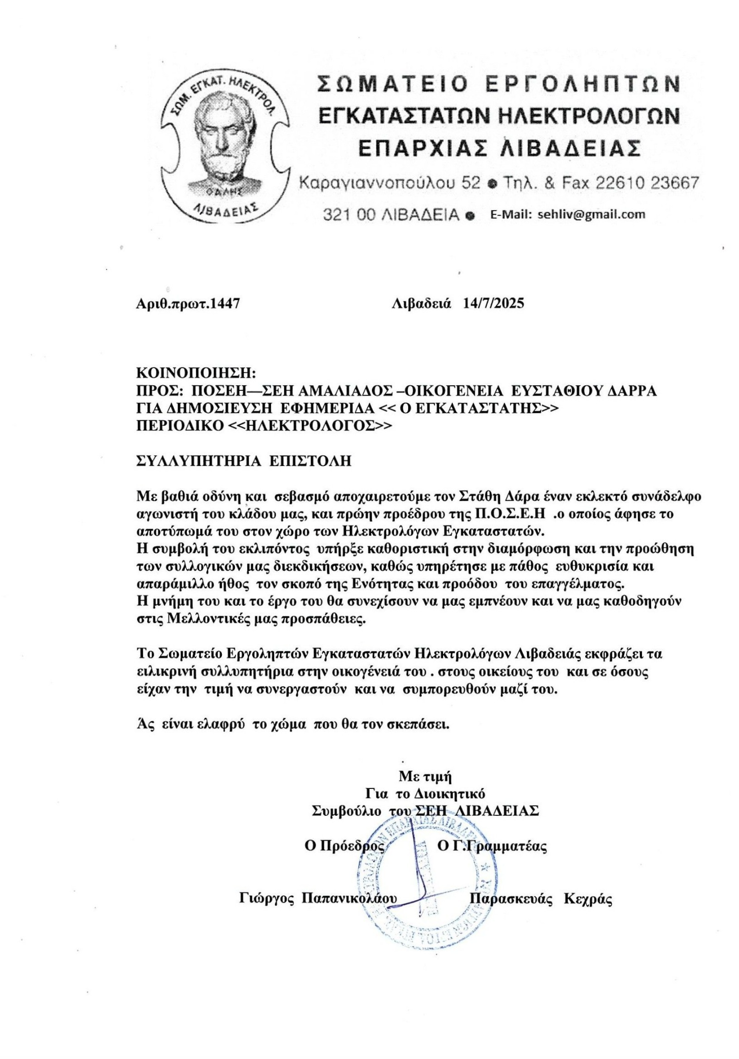 Συλλυπητήρια επιστολή για την απώλεια του Ευστάθιου Δάρα απέστειλε το Σωματείο Εργοληπτών Εγκαταστατών Ηλεκτρολόγων Λιβαδειάς.