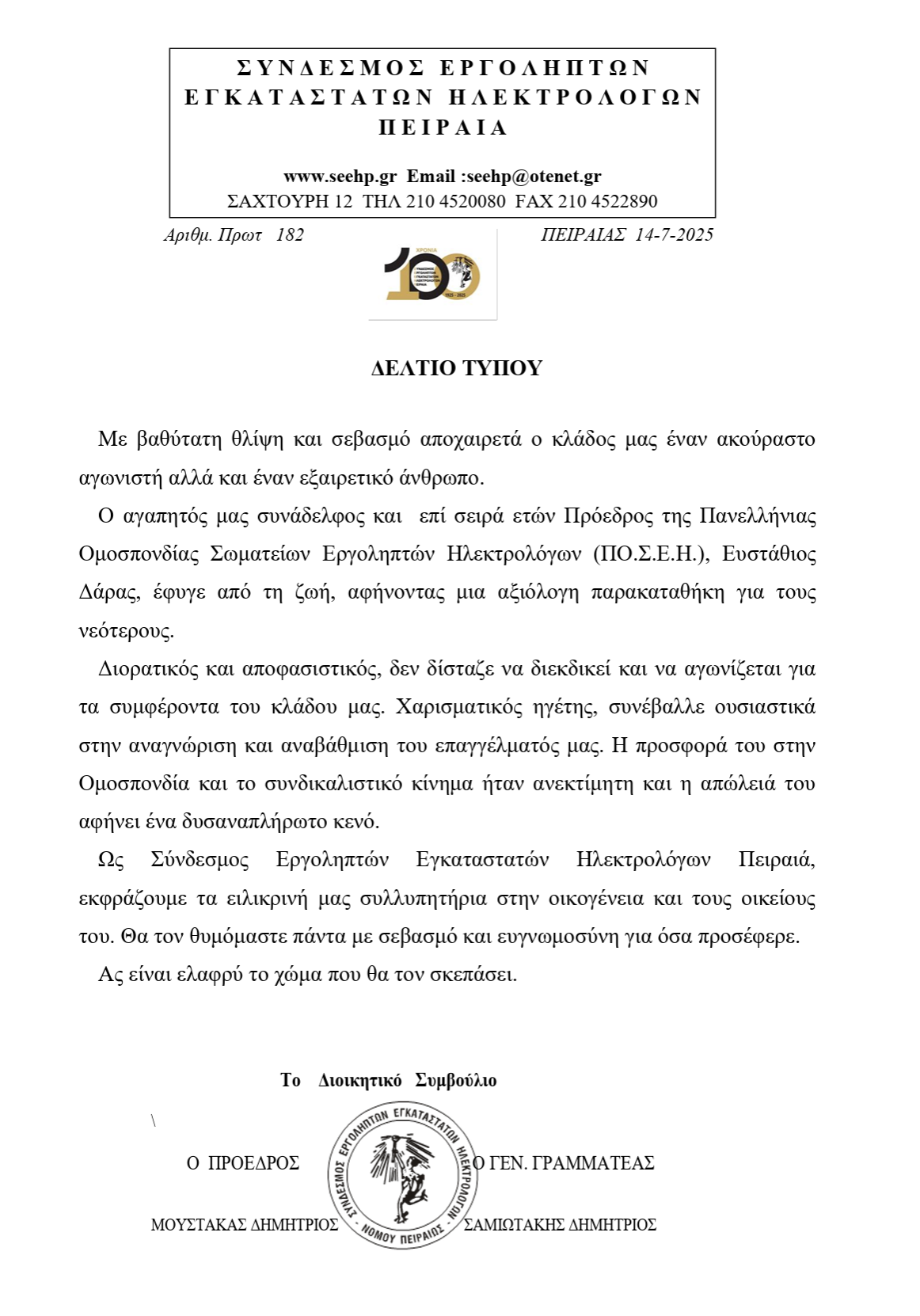 Δελτίο τύπου για την απώλεια του Ευστάθιου Δάρα εξέδωσε ο Σύνδεσμος Εργοληπτών Εγκαταστατών Ηλεκτρολόγων Πειραιά: