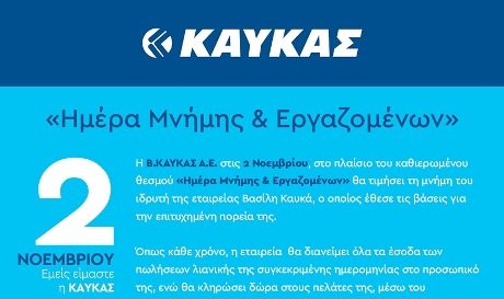 Τη μνήμη του ιδρυτή της Βασίλη Καυκά, ο οποίος έθεσε τις βάσεις για την επιτυχημένη πορεία της τίμησε η Β.ΚΑΥΚΑΣ Α.Ε. στις 2 Νοεμβρίου, στο πλαίσιο του καθιερωμένου θεσμού «Ημέρα Μνήμης & Εργαζομένων».