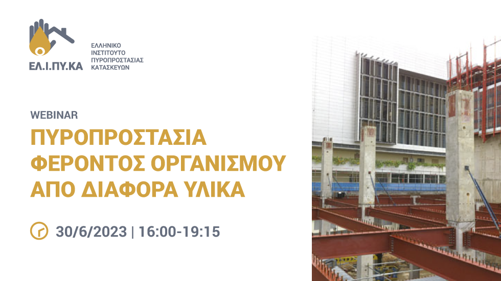 Το Ελληνικό Ινστιτούτο Πυροπροστασίας Κατασκευών (ΕΛΙΠΥΚΑ) διοργανώνει το webinar με τίτλο «Πυροπροστασία φέροντος οργανισμού από διάφορα υλικά» την Παρασκευή, 30 Ιουνίου, 16:00-19:15, ώρα Ελλάδος.